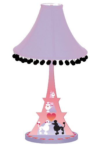 Our Eiffel Tower Lamp is has black and white poodles rubbing nostrils. Base is decoratated along hearts. Includes purple material coated bell shape coloration and brass finsihed fixtures. 18"H x 9" Diameter tasteless.
